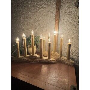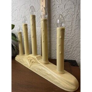 This product is a set of two vintage 5-light candle electric candelabras designed for Christmas decor. The candelabras feature a clear light color with a beige plastic material, medium size, and easy installation. The candles have a festive bell-shaped design, perfect for adding a warm and cozy ambiance to any indoor space during the holiday season. Made in the United States, these candelabras are corded electric and operate at 120V, offering a charming and decorative lighting solution for Christmas celebrations.