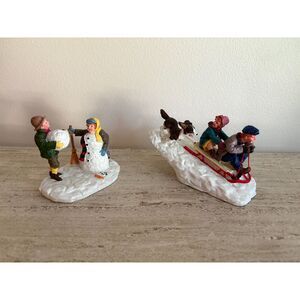 2. The Memory Markers Collection - Racing Downhill - 2 figures sledding on a traditional sled / toboggan with a dog chasing after them. spaniel/ terrier looking dog. - approximately 4.5" tall