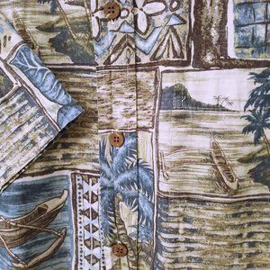 Lot of two (2) Vintage 80s-90s Tops, Bishop St. Apparel Hawaii Made in USA, Abstract Geometric Aloha Button-up Shirts, identical except for pattern/color Men's-Large, chest Pocket, coconut buttons, Short SLeeve, side Vents, all-over Tropical Floral Palm pattern reverse print, gently worn-in soft lightweight fabric Easy care cotton in muted shades of multicolor. In pre-owned* condition with no outwardly visible flaws - see pics for detail. Hawaiian Pool Patio Cabana Beach BBQ Summer Travel Leisure Casual Tiki Surf Sand Luau Party Loungewear
