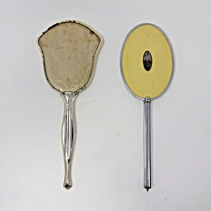 This listing includes a lot of 2 vintage hand mirrors, perfect for vanity décor, display, or restoration projects. One features an ornate Art Deco–style handle with a fabric floral backing, while the other has a simpler chrome handle with an oval shape.