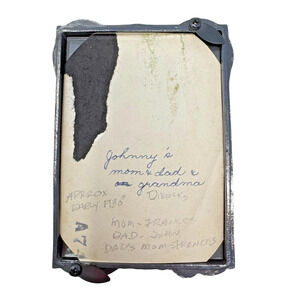 The first frame is a silver-tone metal frame (approx. 4” x 3.75”) with intricate scroll detailing and a pearl accent at the top. It contains an original 1930s family photograph, labeled on the back: “Johnny’s mom & dad & grandma — early 1930s.”