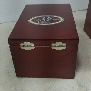 Set of two stained wooden cigar boxes with hinged lids, perfect for creative storage, crafts, or repurposing projects. These boxes feature a rich red-brown stain, branded cigar labels, and a classic rectangular shape.