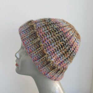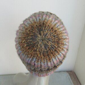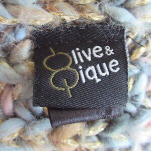 The Olive & Pique beanie hat is multicolor with metallic threat in gold tone, it can be worn fitted or slouchy. Condition is pre-owned.