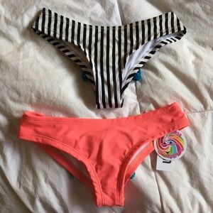 Pacsun "Kandy Wrappers" lot of 2 cheeky bikini bottoms with a bow back. First is black and white striped featuring a blue velvet bow NWOT. Second is salmon featuring a real velvet bow NWT