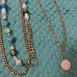 Lot of 2 happy face motif necklaces. One is a gold tone chain with pink enamel smiley face pendant. The other is a double strand gold tone and beaded chain with faux pearls and blue and green smiley face beads. Smoke-free and pet-free home.