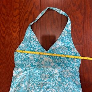 1. The Limited - light blue and white Hawaiian print halter dress with side zipper - Size 10 (vintage size 10, fits a medium).