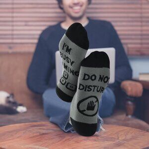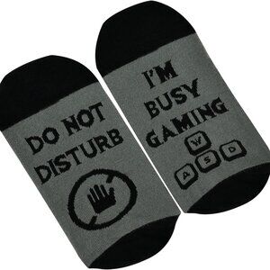 Funny and comfortable "Do Not Disturb, I’m Gaming" socks for gamers. Made from a high-quality cotton blend (85% cotton, 12% nylon, 3% elastane), these socks are soft, breathable, and stretchy for all-day comfort. The bold lettering on the soles makes them a fun novelty gift.