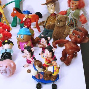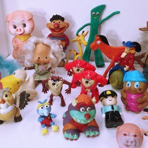 Lot of twenty-seven (27) Vintage 70s-80s Collectibles Hobby Toys Collection, Assorted Figures Characters, Mascot Plastic Rubber Plush Toys Doll Action Figure, many are marked - tagged - logos, miniatures to 11", Advertising Films Movies TV Cartoon Comic Fast Food, Happy Meals McDonald's, Carl's Jr Karcher My Pet Monster 1988, Wicket Ewok, 60s squeeze rubber Piggy, 1972 Ernie, Toy Story Woody, Hong Kong, Munchkin, 1988 Disney, My Little Pony 1987 purple, American Greeting 1979, Taz tasmanian devil x3, Hanna Barbera pigs, Hasbro Skateboard dog Smurf 1985, Buddy L Corp mini cop 1988, Gumby Pokey, mean ugly pig head, pelican, clown, monkey, bendable giraffe, cowboy on barrel, kitty cat, owl, inch worm. In used 'As Is' pre-owned* condition, with wear to include dings, scuffs, blemished, missing accessories, dirty - see pics for details. Priced accordingly -Not sold separately.