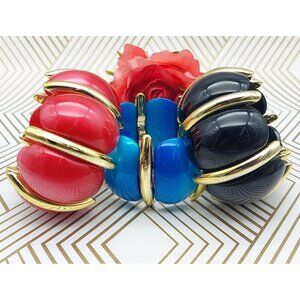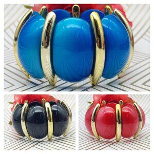 Lot of 3 Acrylic Statement Bracelets Stretch Wide Gold Tone Trim Blue Black Red
