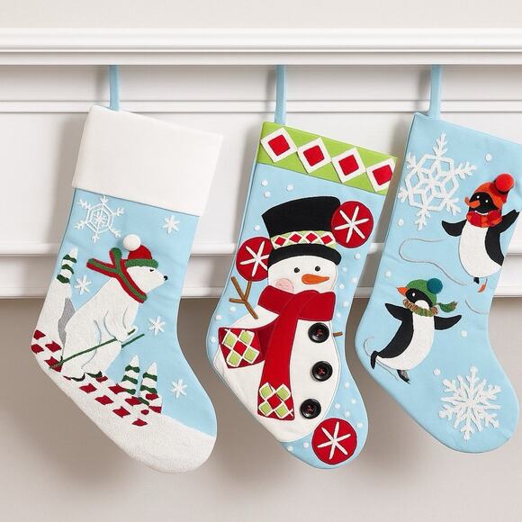 Cute blue Christmas stockings with penguin, snowman, and polar bear appliqué — cozy winter holiday vibes. Festive set of 3 embroidered and appliqué Christmas stockings by Alice Doria, featuring cheerful winter scenes on a soft icy blue background. Each stocking showcases layered fabric appliqué details, embroidered snowflakes, and charming textured accents — including a skiing polar bear, a snowman with peppermint swirls, and two playful penguins bundled in scarves and hats. Pre-owned, clean and gently used; no stains or damage noted. Refer to images for condition. Due to light and screen difference, the color may be slightly different from the picture.