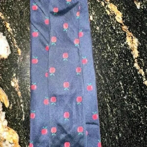 A set of three pre-owned ties. The first tie is navy blue with a red apple pattern. The second tie is green with a red and white candy cane pattern. The third tie is navy blue with a red heart pattern. All ties are in good condition with no visible imperfections. The ties are approximately 57 inches long and 3.5 inches wide. The ties are made of silk and have a satin finish. The ties are suitable for formal occasions.