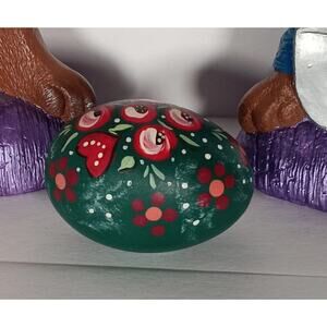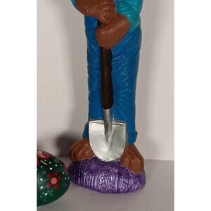 One rabbit holding shovel and other holding a carrot. Hand painted ceramic egg. Rabbits measure approximately 10"H.