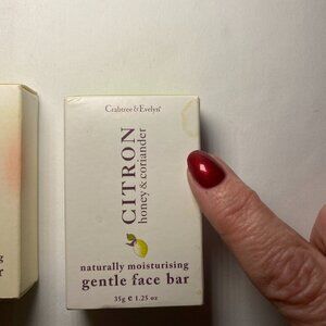 New in box travel sized Crabtree & Evelyn Citron Honey & Coriander naturally moisturizing gentle face bar soaps. Lot of 3 1.25 oz bars. Boxes show shelf wear, please see pictures.