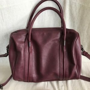 All items are man-made leather. The Burgundy & Brown bags are from Forever21; tan bag with tassels is from Target and is the T-Shirt & Jeans brand.