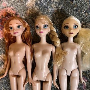 Two Elsa and one Anna. No clothing or shoes included. All parts intact with the exception of Anna’s right hand, which may have been chewed by a bear during one of her adventures.