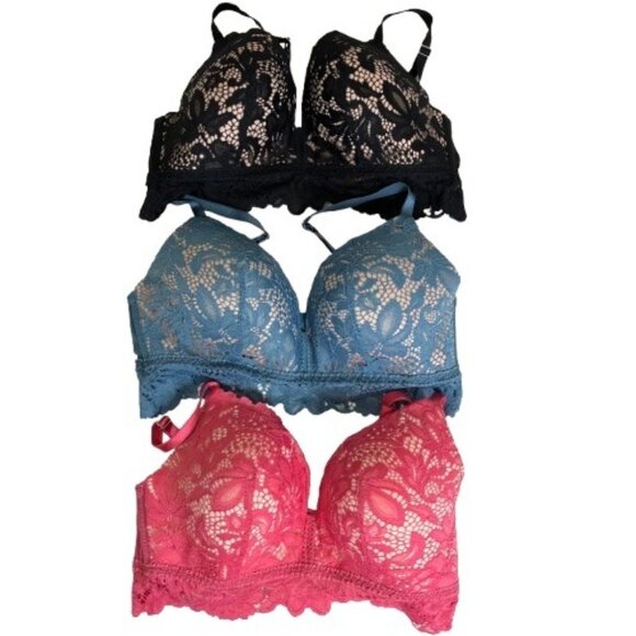 Lot of 3 Hunkemoller Lace Bralettes Pink Black Blue Size 36D