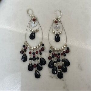 Third are silver tone multi tier teardrops with a heart charm, burgundy and silver round beads along with teardrop shaped faceted black beads, measures 4.5 inches long.
