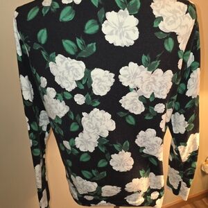 This lot includes 3 Merona women's cardigan sweaters in size XL. Sweater one is a pink/lilac solid color with decorative trim. It has 3/4 length sleeves. Sweater 2 has a white floral design and full sleeves. Sweater 3 is a blue/green floral design with full sleeves. All are button-up. They are made from a cotton blend fabric, they are lightweight and suitable for various occasions like travel, casual wear, and work settings throughout all seasons