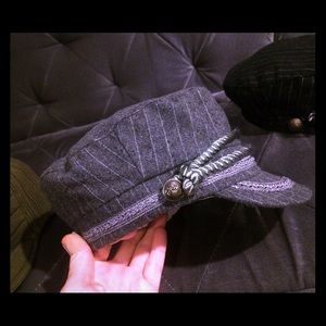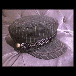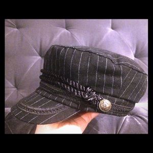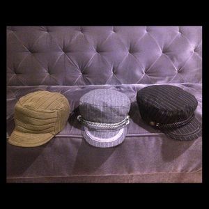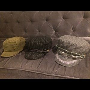 3 kick ass hats - 2 brand new military pin striped caps embellished with beautiful trim and military style button - originally purchased from World Market at $24.99 each -- 1 knitted pre-loved sweater materialed cotton/acrylic army green hat - All 1 size fits all. Great bundle deal at 3 hats for the price of 1 !!! Price is firm priced at lowest- ;-) thank you for looking!
