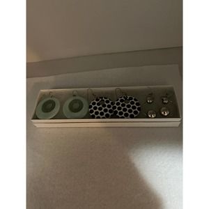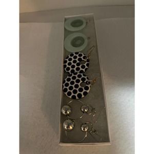 3 pairs of earrings: black & white polka dot, light green & darker green & silver-tone. Pre-loved fashion earrings. Good condition.