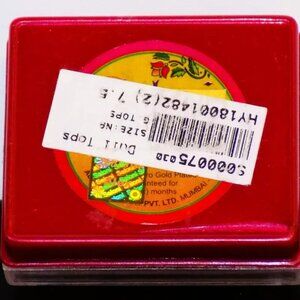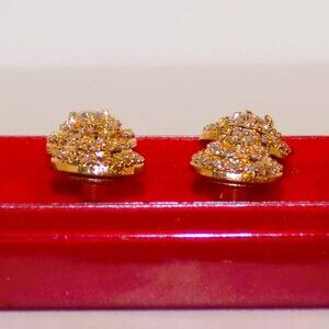 All earrings are 23.5K gold plated & come in original cases with labels on the bottoms. Set of 2 pairs crystal or CZ studded 12mm earrings are about 1/4" deep. They have threaded posts with screw-on backs. The white sticker description is "Stone Imp". The white sticker covers most of the Saloni holographic sticker. The clear plastic box lid has small cracks at the corner lips. The single pair of 9mm wide by 5mm deep earrings are textured with smooth rings & regular bullet post backs. The top white sticker reads "Doll Tops" as the description. The holographic Saloni tag reads, "Alex." Made in India.