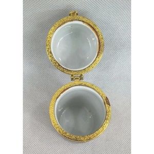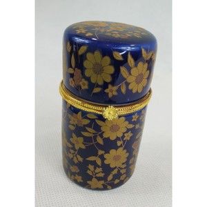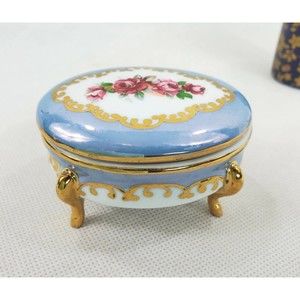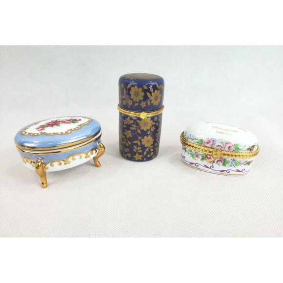 Lot of 3 Porcelain Trinket Boxes Pink Flowers Red Roses Purple Flowers Gold Trim. 2 have hinges and the blue and gold one does not have hinges.