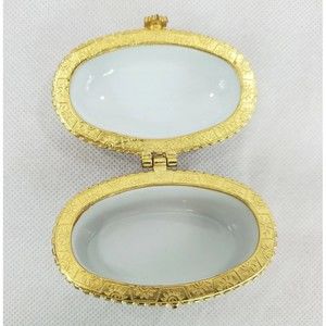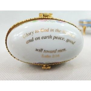 The white and gold one measures 2.75 inches long 1.5 inches tall. This one has the Bible verse Luke 2:14 inscribed on the top of the lid. See pictures