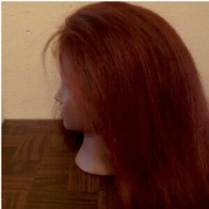 1. This is an older lace front wig. Circumference: 24”, 18 inches long. There are no labels in it. There is a large section in the top where the hair is missing from the lace (see pic). There are 5 small hole in the front & side lace. There is some dinginess to the cloth around the lace. There is still some adhesive in the lace front that I can’t was out. This wig was brown & has been dyed to get that reddish brown color. Some of the dye still comes out in the wash but not a lot. Here is a great buy if you know how to ventilate & repair a wig. Since I don’t have the time or the desire to do it I’m selling it at a good price for human hair.