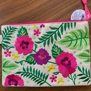 100% Natural Cotton with embroidered and sequined flowers. Made in India. Fully lined with a zipper closure. Can be used as a purse or as a carrying case to hold small items.