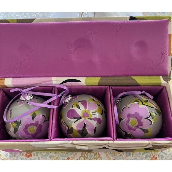 Lot of 3 Vera Bradley hand painted floral glass Christmas tree ornaments retired 2012