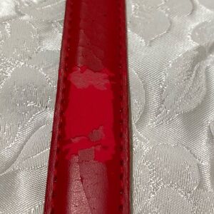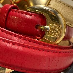 Anne Klein for Oroton Red Leather Belt - A striking red belt featuring a chic gold buckle and a leather belt loop for a clean finish. Please note: there is some minor peeling on the leather from an estate sale price tag, but it remains a standout piece.