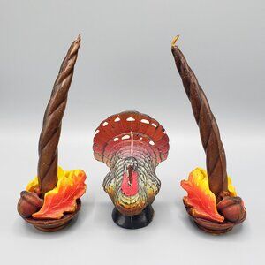 Lot of 3 vintage Gurley candles, with one featuring a 4-3/8" tall Thanksgiving Turkeys and a pair of 6-1/2" tall candlesticks with leaves and an acorn around their base. The candles are in good condition with unburned wicks.