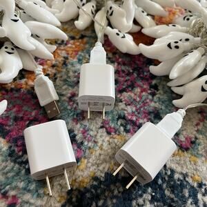 Each one is about 18.75 feet long for a total of 56.25 feet. This does not count the 20” of wire to adapter on each. These are all usb plug but I did add the wall adapter. They did not originally come with these. I used 2 strands last Halloween the other strand wasn’t used. All 3 are shown on. You may want to add your own adapters that work best for you. They are in good condition!