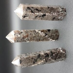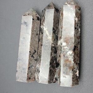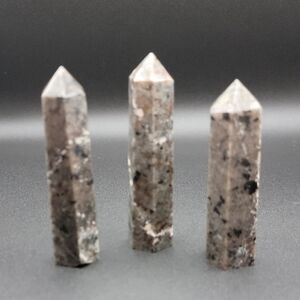 You are purchasing all 3 pieces of Yooperlite. The tallest tower is about 3-3/4", and the smallest is 3-3/8" tall. All 3 weigh 234 grams. This is a perfect set of 3 to set on your favorite shelf, desk, or in a curio cabinet. Put a black light on them and watch the fire color pop out. No cracks or chips. Perfect points.