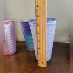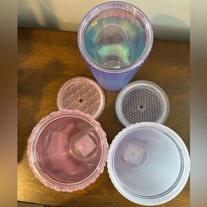 These are new with tags. There is only 1 straw included and can be used interchangeably for all 3 cups. Two have lids one I managed to break the lid on. You can mix and match them for your needs of the day.