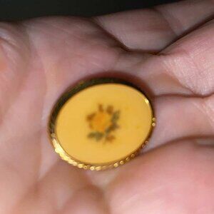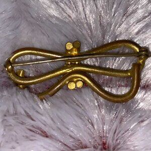 Lot of 70's brooches. Top brooch is gold tone 2inches long and 1 inch wide. No hallmarks and little bit discoloring.. Left is gold tone enamel flower 1. Inch long and half inch wide with no hallmarks. Right is silver tone Rhinestone and inch in diameter. No hallmarks.