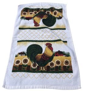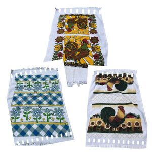 Lot of 3 vintage kitchen towels . Two roaster ones and one checked floral. One roaster one has faint yellow discoloration. Hard to see but in pics.