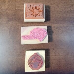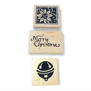 Lot of 3 wooden block rubber stamps Christmas Theme Merry Poinsettia Bell