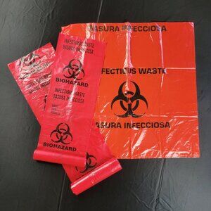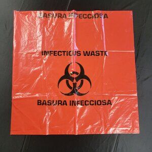 Available is a lot of 30 small biohazard bags measuring 19 x 8 inches, and one larger bag measuring 23 x 23 inches.