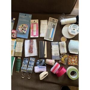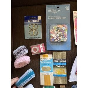 Lot of 36 New/Vtg Sewing Notions, Supplies, Buckles,Buttons Tape, Clasps, Ribbon