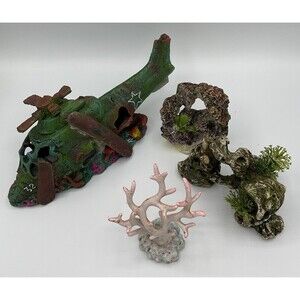 This lot of 4 aquarium fish tank decorations includes a crashed helicopter wreckage and three coral pieces, all made of polyresin material. The multicolor ornaments are designed by Betta and manufactured in China. Perfect for adding a unique and whimsical touch to your fish tank, these decorations will enhance the visual appeal of your underwater world. Ideal for Betta fish and other aquatic pets, these decorations provide a fun and safe environment for your fish to explore and enjoy.