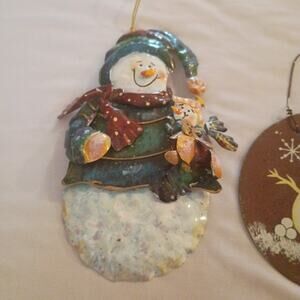 3. Metal Circle With Hand Painted Snowman & Penguins Winter Snow Scene
