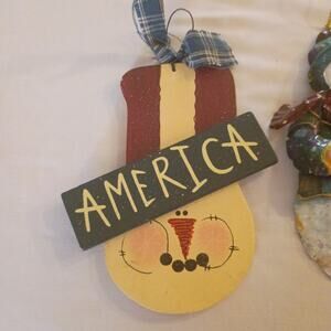 1. Patriotic "America" Country Primitive Folksy Snowman with Hat, Wooden Material