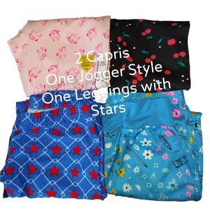 Lot of 4 girl's casual bottoms - One is NWT, and the other three are NWOT. The pink capris are NWT - Cat & Jack. The cherry capris are Arizona Jean Co. The super soft red star leggings are Home of The Brave. Last but not least are the cute Cat & Jack joggers (maybe PJ bottoms) with flowers, paint brushes, crayons, pencils, and erasers.