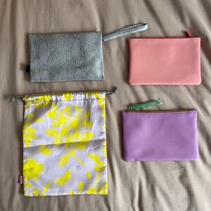 These 4 bags are unused. Three have a zipper closure and one is a slightly larger drawstring bag.