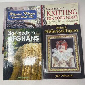 This collection includes four diverse knitting pattern books covering a range of projects: mosaic afghans, pillows, and historical figures. Perfect for crafters seeking creative inspiration and guidance for unique knitting projects.