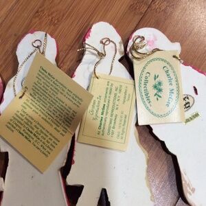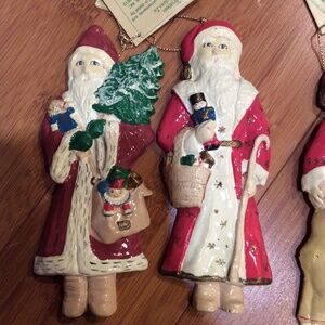 Set of 4 Christmas tree ornaments in the shape of various santa clauses. Vintage 1982.Measure approximately 6" tall.Made of bakers clay. Charlee McGee Collectibles, Ltd. New York. Still with tags on.