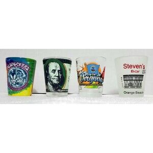 This is a unique lot of 4 souvenir shot glasses, each representing a different location or theme: