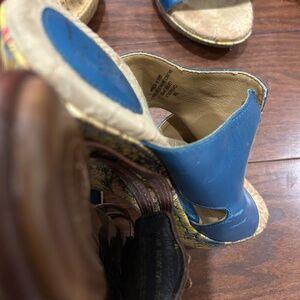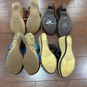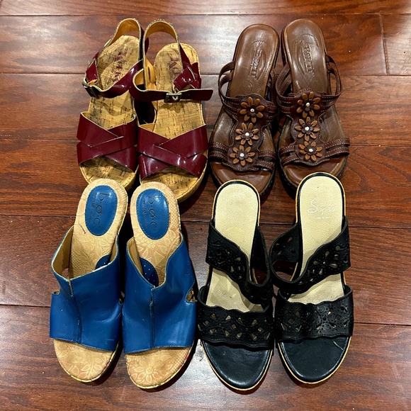 This is a Lot of 4 Strappy Wedge Sandals and Wedge Slip on Sandals in Size 7. Brands are Born, b.o.c., Korks and Sotto Sopra. Colors are Maroon/Deep Red, Brown, Blue and Black. All shoes are size 7.
