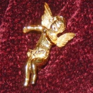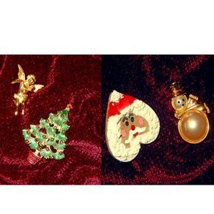 Four vintage holiday/Christmas pins - all in great condition. The sweet angel can be worn any time of the year for protection or to show faith. The back of the angel is gold toned. Angel is approximately 1 1/2" and the tree is around 2 1/4". The tree has green foliage with a red star and container. The tree ornaments are gold with red ones near the bottom of the tree. The angel has a sparkly decor around the waist. The wings have a sculpted design - so pretty. The Santa pin is artisan created - wooden with paint and 3D elements. Artist's initials on back. The snowman pin is gold toned with a white belly & head - painted eyes and mouth. Gold toned trim, hat and scarf. Gold toned back. The Santa & the tree pins are approximately 1 3/4" in length. The snowman can be worn during the entire winter season. Lots of charm and fun in each item. Keep one or two and give others as a gift. Traditional pin closure. Two gift bags included. Offers welcome.